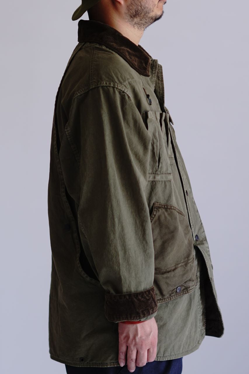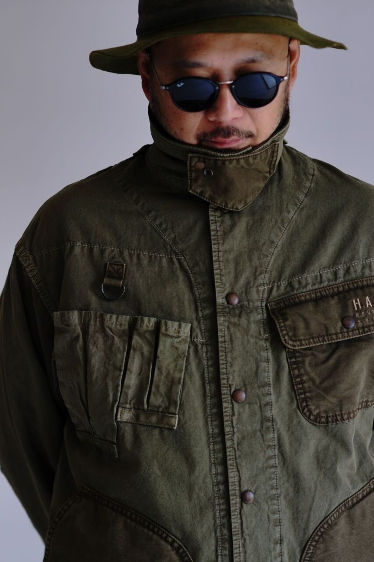 ミリタリー・ハンティング・ワークという三大要素を取り入れたカバーオール。クラシックなハンティングディテールを再解釈し、機能性と存在感を兼ね備えた一着に仕上げました。薬莢ポケットやゲームポケットといった実用的ディテールを現代的にアレンジし、アウトドアからタウンユースまで幅広く対応します。