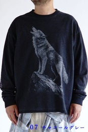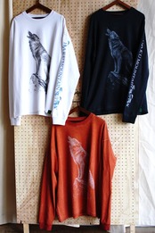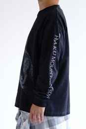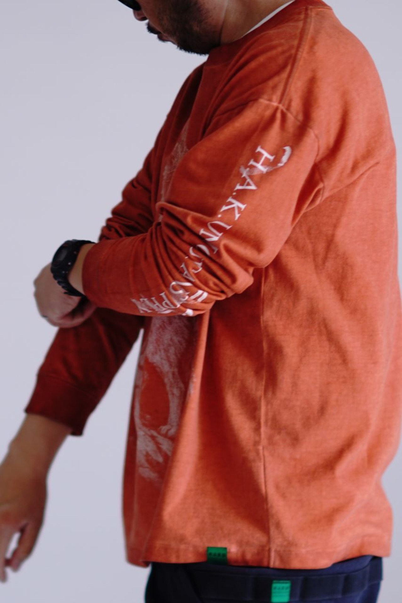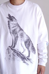 フロントにはブランドアイコンであるリアルタッチのウルフプリントを配置。古着Tシャツに見られる油性インクのプリントを再現し、独特の存在感を演出しています。さらに両袖には「H.A.K.U MOUNTAIN SUPPLY」のロゴプリントを施し、デザイン性とブランドらしさを強調。