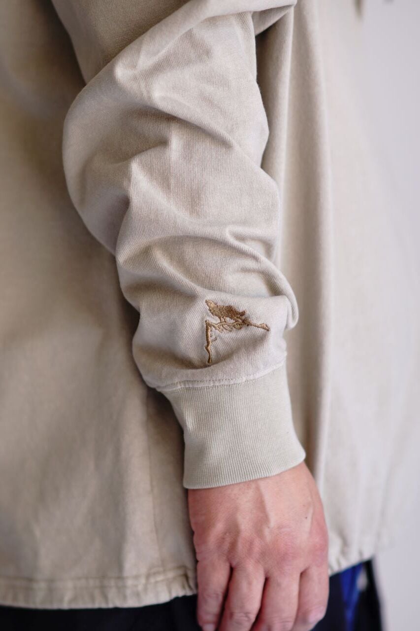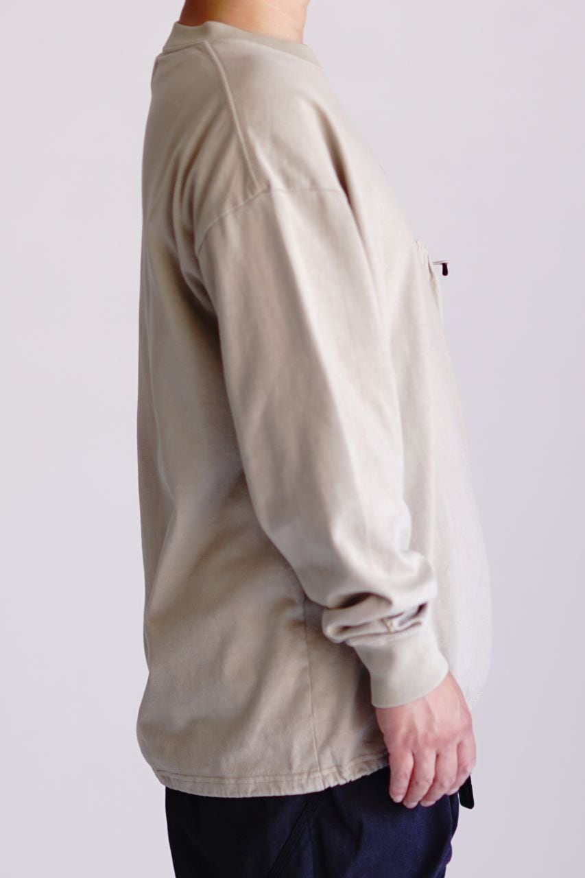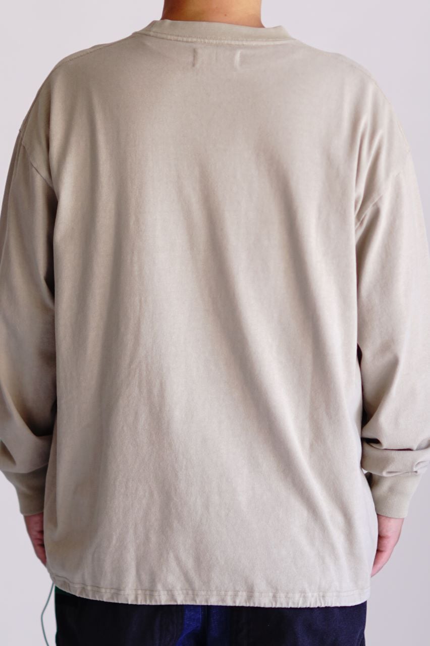 9.5ozのオリジナル空紡天竺 [CABIN JERSEY] を採用したヘビーウェイト仕様のTシャツです。反応染料による製品染めを施すことで、生地に柔らかな風合いと自然な表情を加えています。裾にはスピンドルを備え、シルエットのアレンジが可能。アウトドアディテールを取り入れながら、タウンユースにも適したデザインに仕上げています。