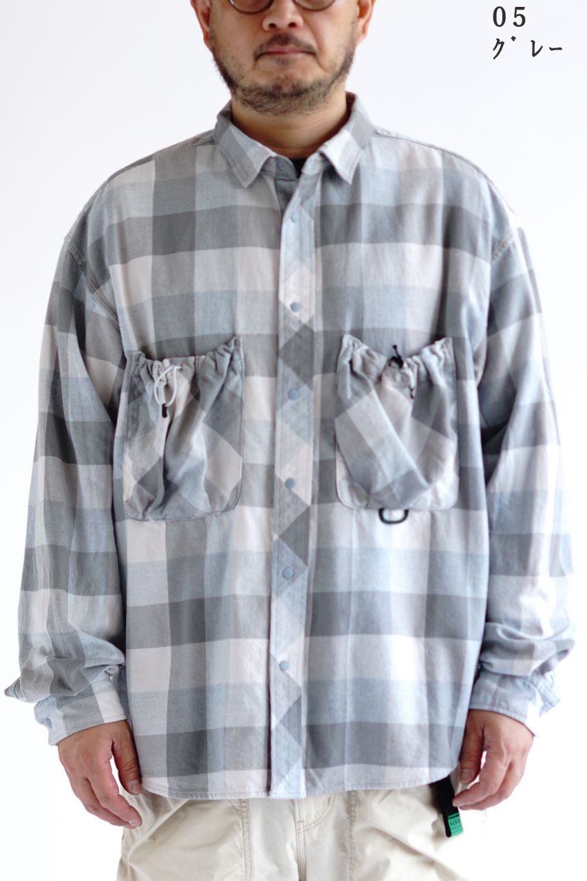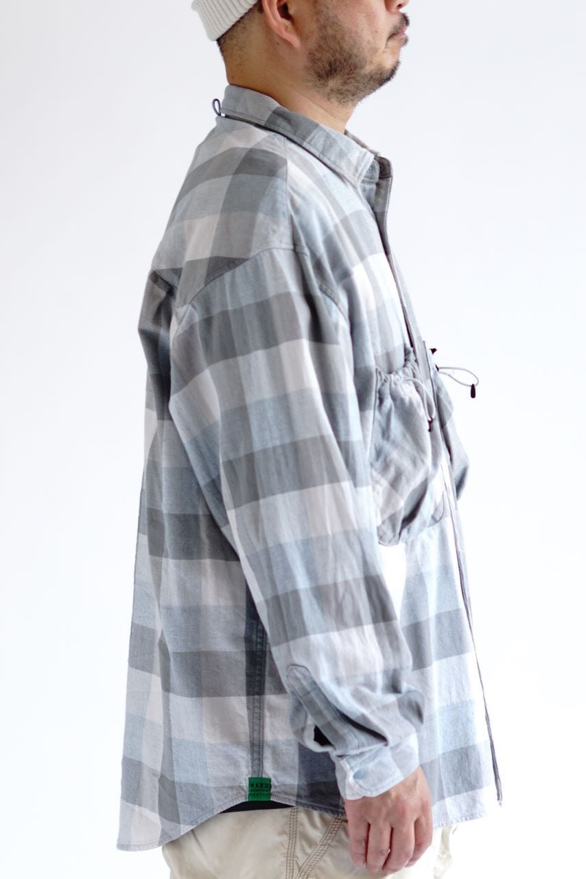 国内有数の産地・兵庫県西脇市で織り上げられた 播州織のインディゴ染めフランネルチェック生地 を使用。加古川支流の良質な水と染色技術に支えられた鮮やかな発色が特徴で、着用と洗濯を重ねることでインディゴ部分が経年変化し、味わい深い表情へと育っていきます。