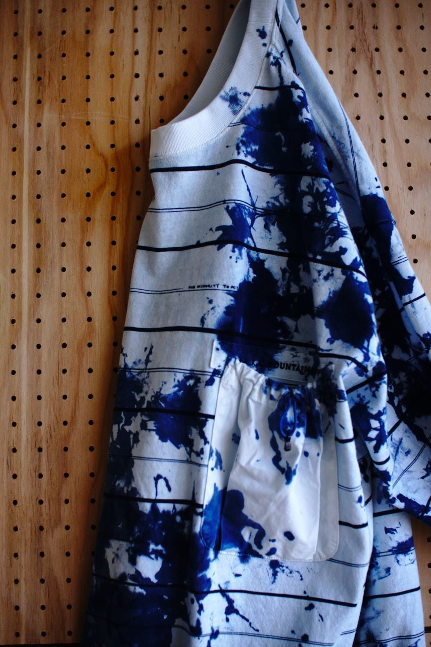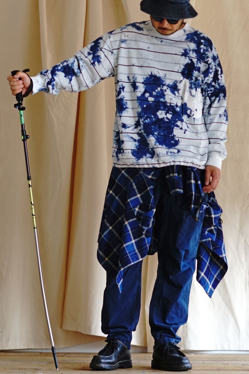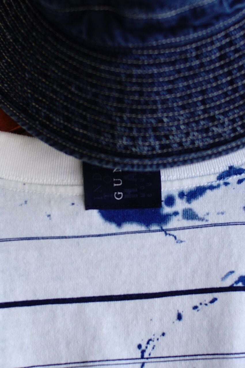 H.A.K.U MOUNTAINSUPPLYのドロストポケットBIG-T「HK-T610」をボディベースにした、特別な「GUNJOハンドダイシリーズ」です。肉厚でタフなオリジナルボディに手書き風ボーダーをプリントし、さらに自社工場で一点ずつインディゴ染料を注ぎかけ染め上げるという、非常に手間のかかる工程で仕上げました。