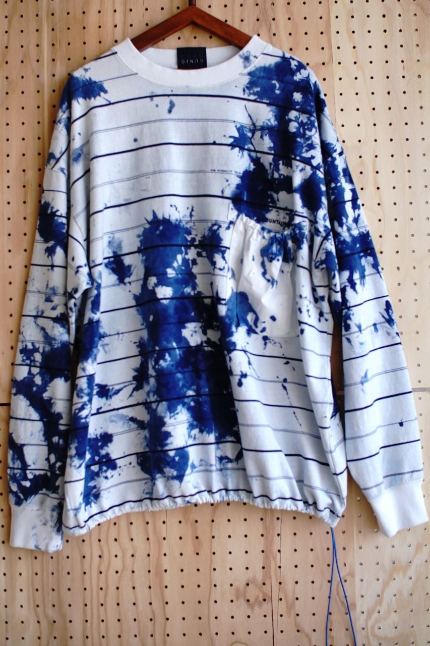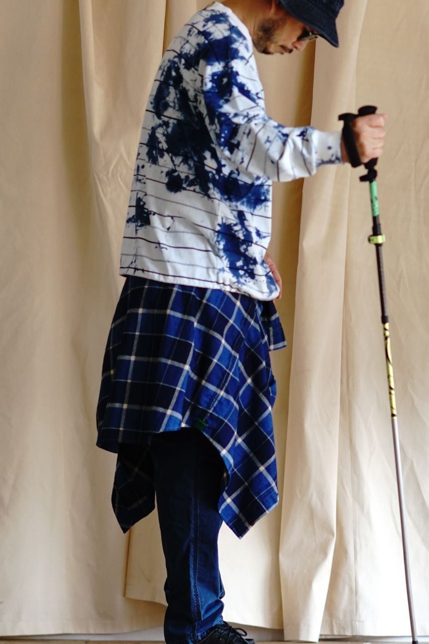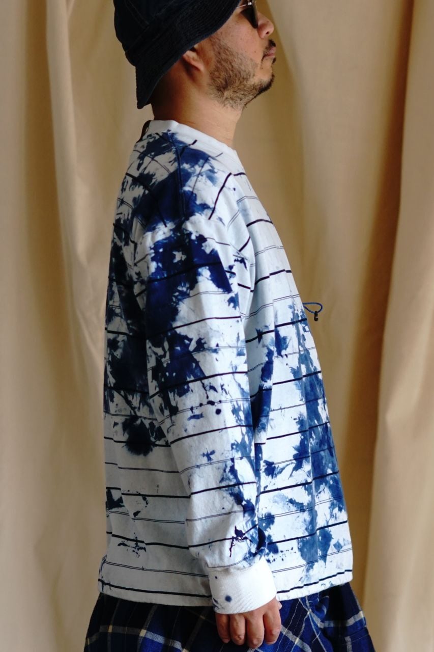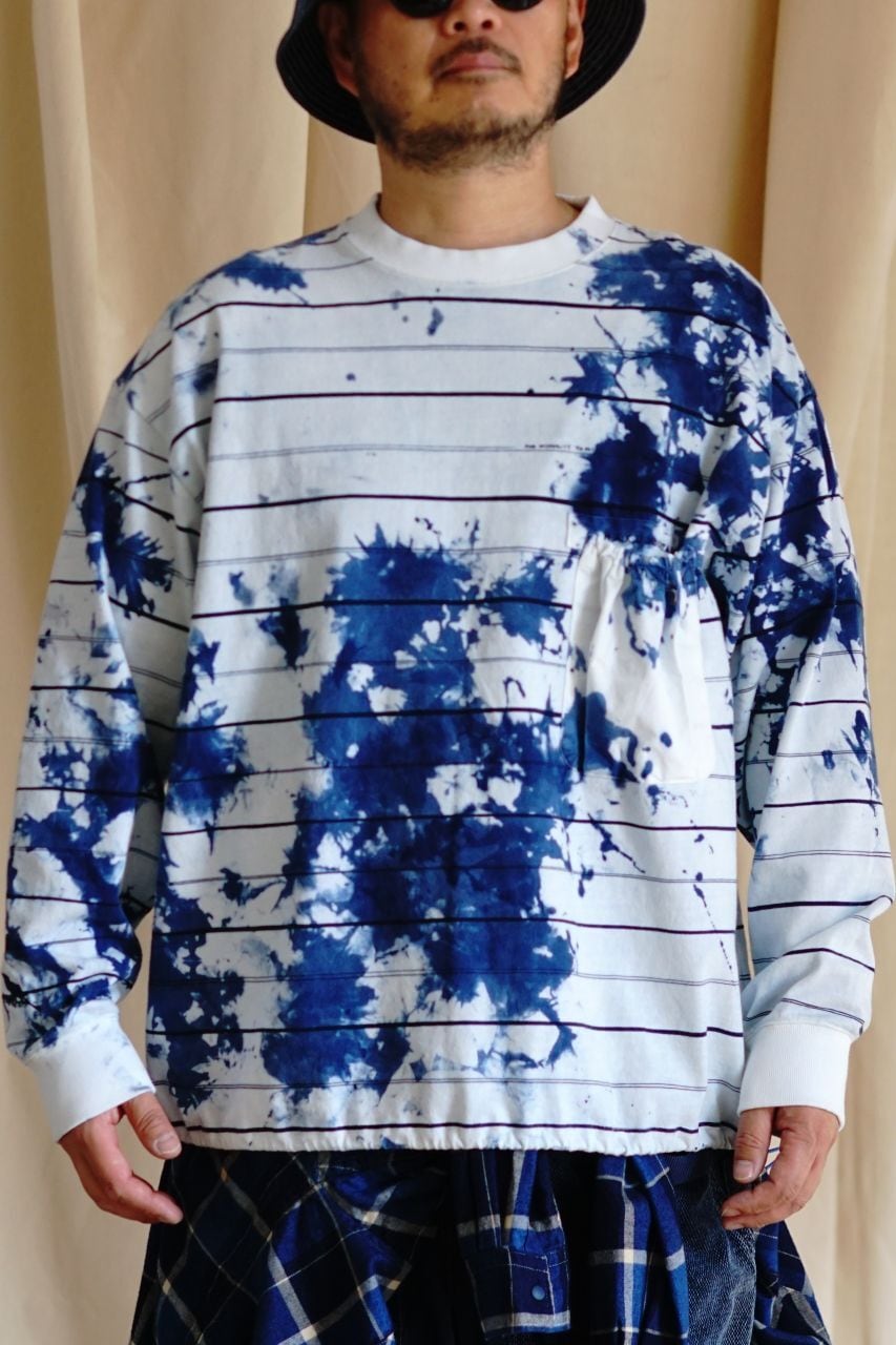 H.A.K.U MOUNTAINSUPPLYのドロストポケットBIG-T「HK-T610」をボディベースにした、特別な「GUNJOハンドダイシリーズ」です。肉厚でタフなオリジナルボディに手書き風ボーダーをプリントし、さらに自社工場で一点ずつインディゴ染料を注ぎかけ染め上げるという、非常に手間のかかる工程で仕上げました。