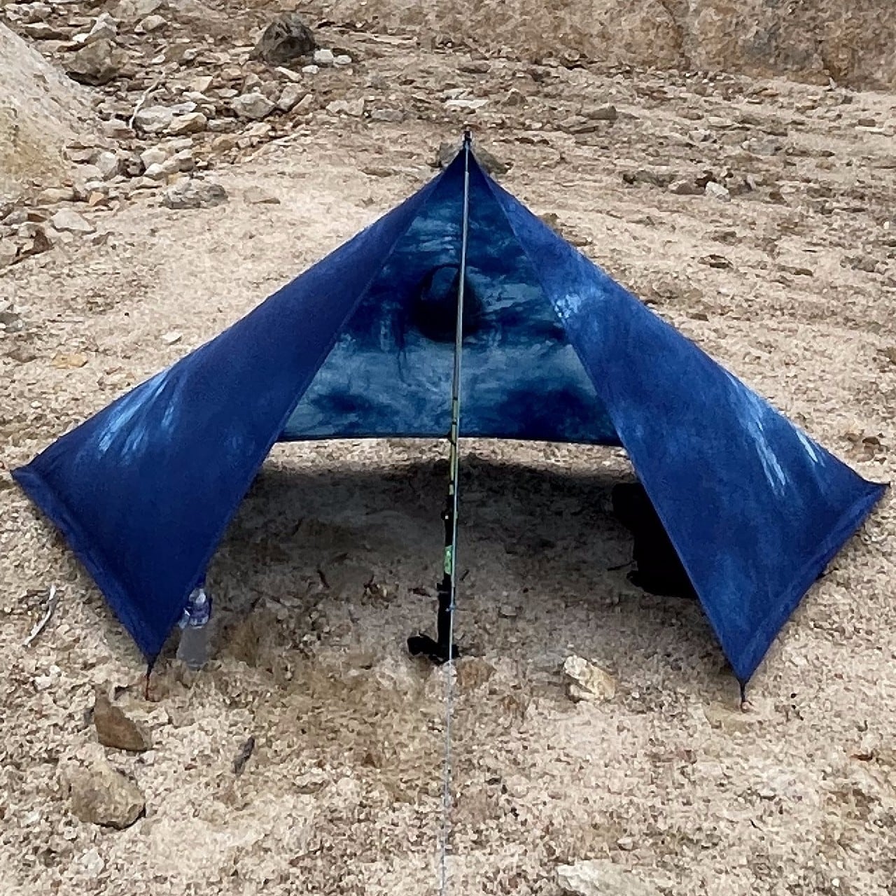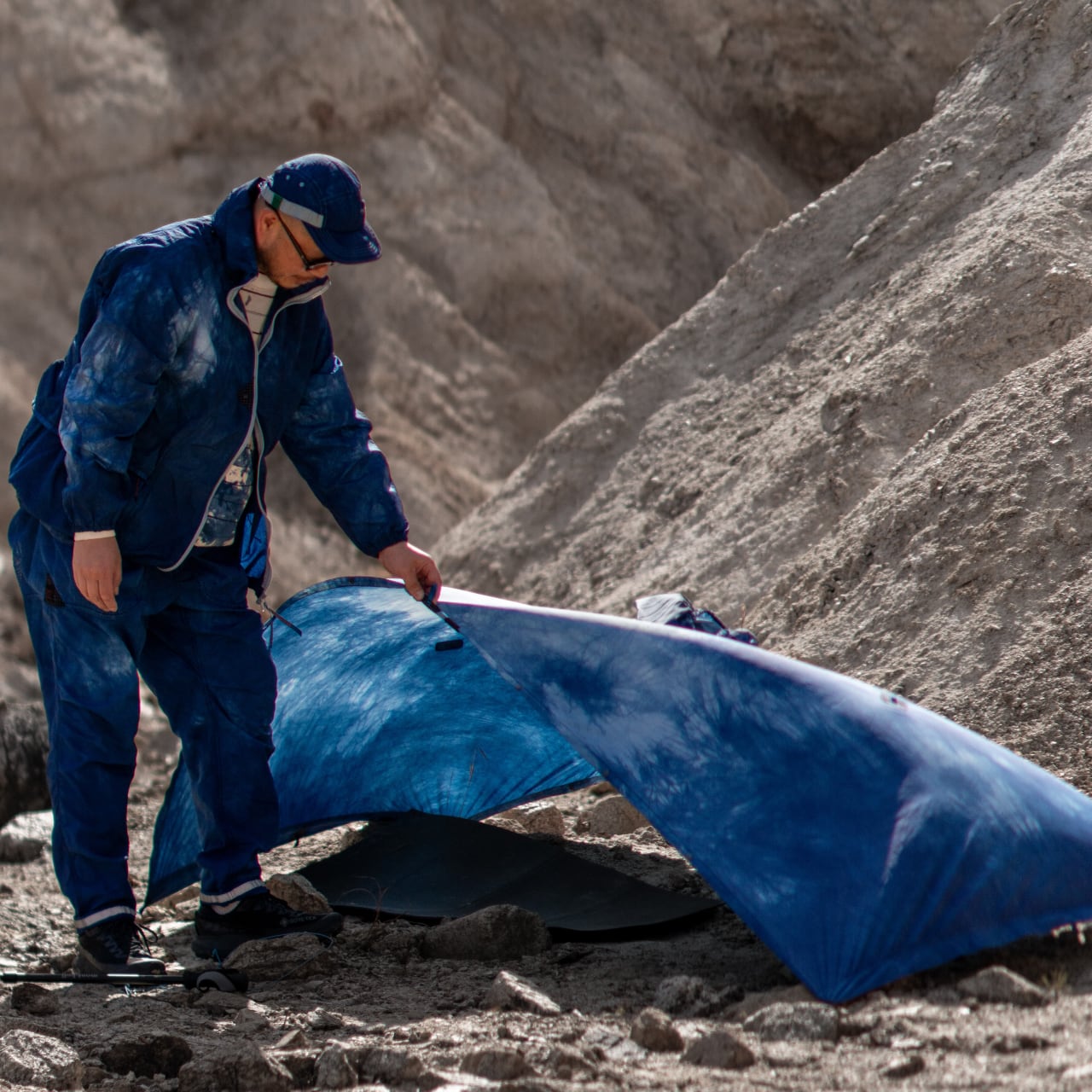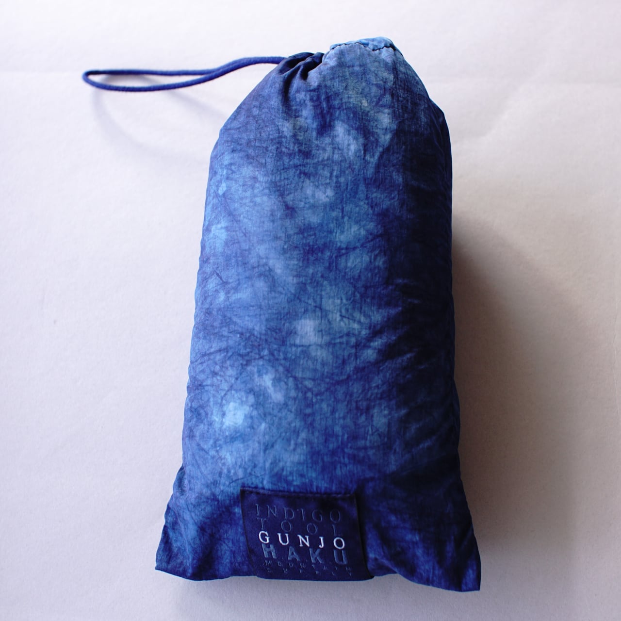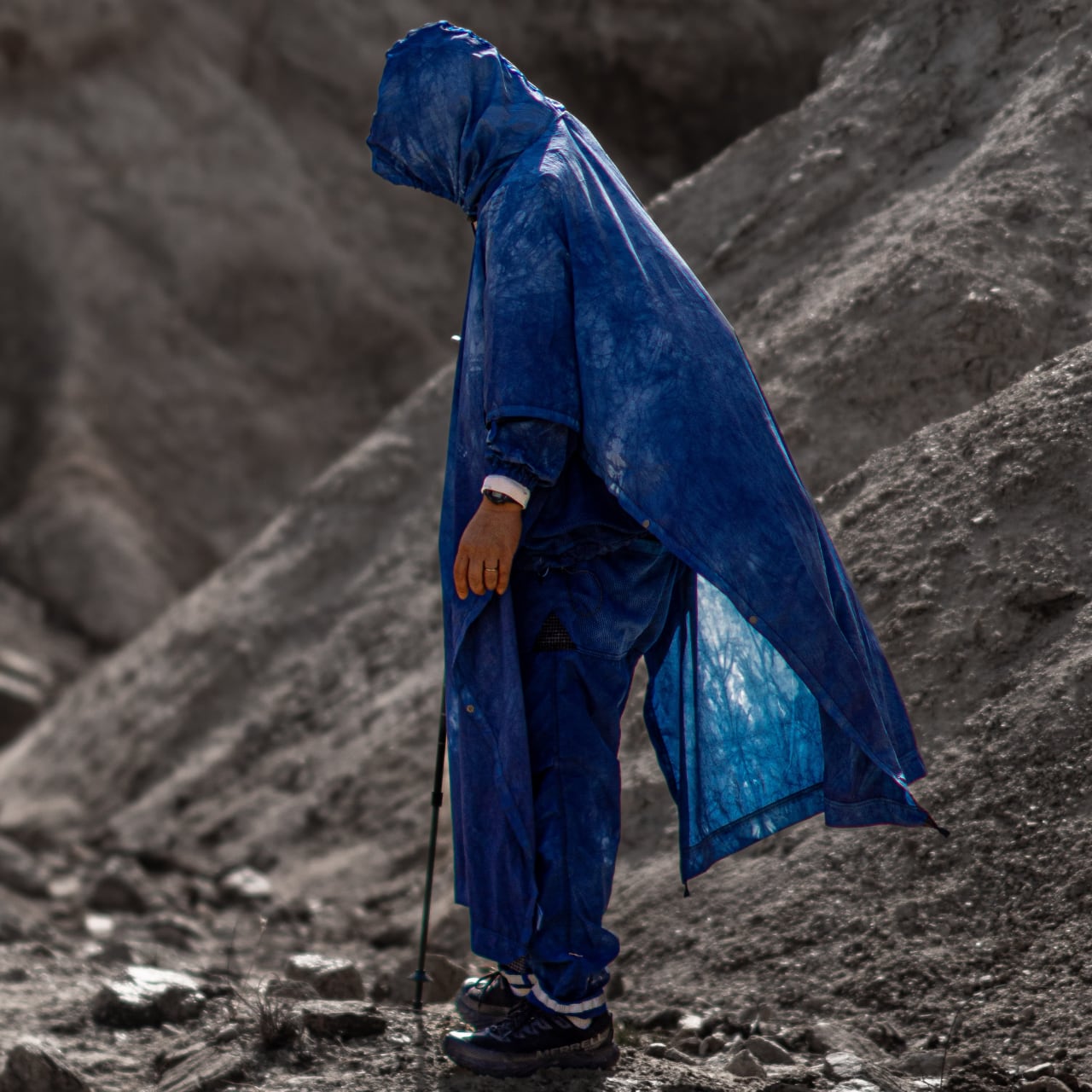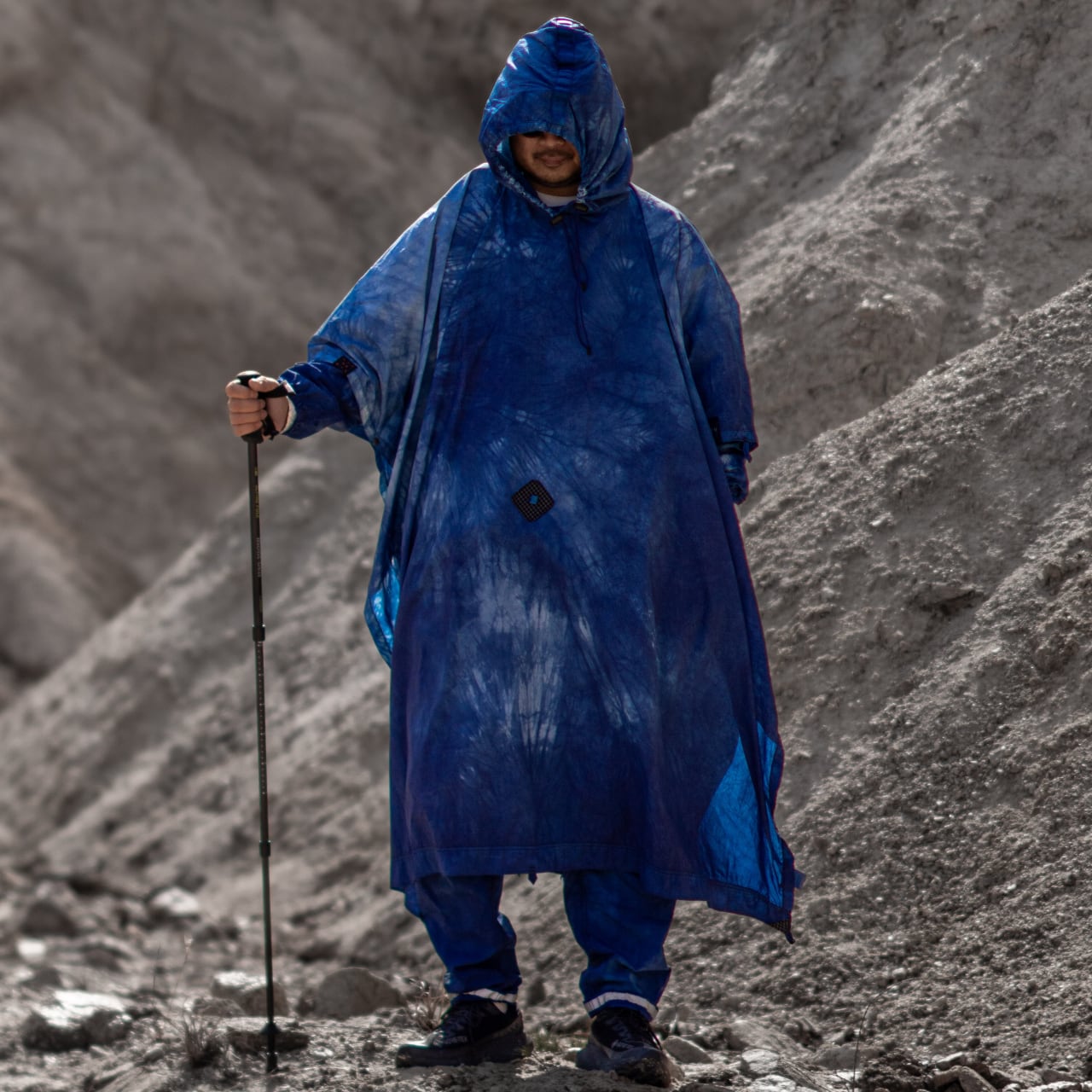 1枚で「着る・張る・守る」をこなす多機能ギア。雨天時はレインウェアとして身体を守り、設営すればタープや簡易シェルターへと変化します。状況に応じて役割を切り替えることで、装備の軽量化にも直結。さらにGUNJOは、ここに“インディゴ手絞り染め”という美しさを加えました。機能だけでは終わらない、所有する喜びと使う楽しさ。その両方を満たす、唯一無二のポンチョタープです。