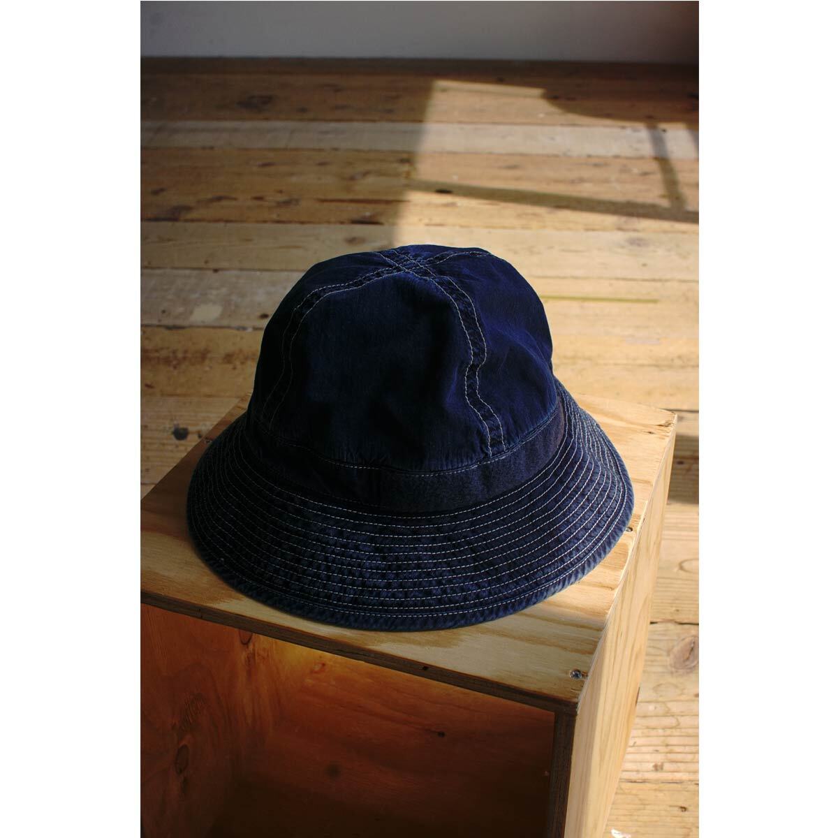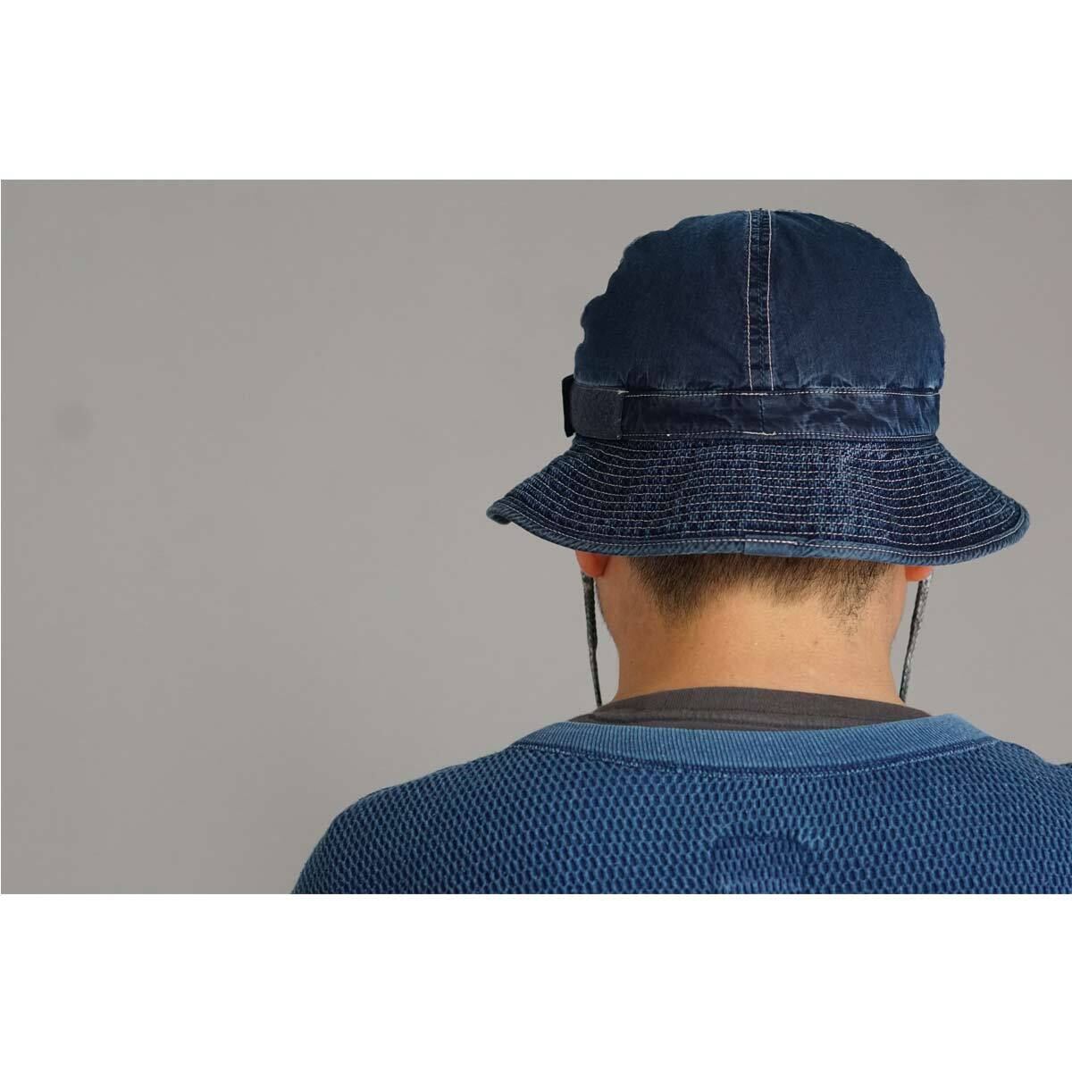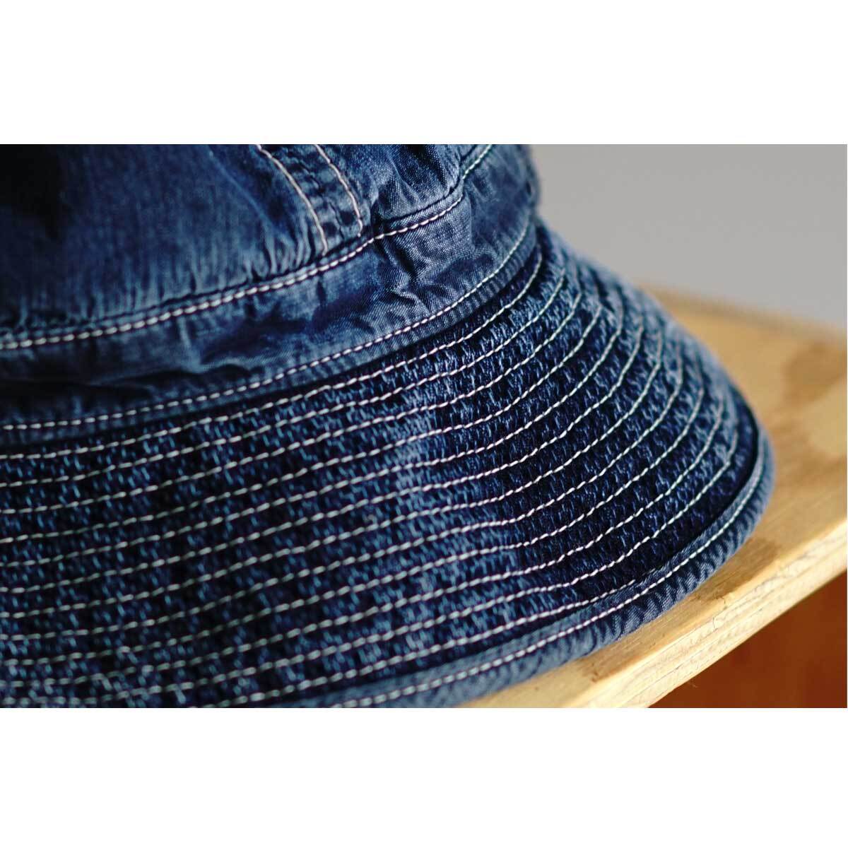 【ロープ染色】でインディゴ染めした綿糸と、強度の強い【フィラメント糸】というナイロンを「ジャガード織機」で織りあげた難燃性&撥水性を兼備したインディゴテントクロスをハチの部分に配し、ツバの部分にはインディゴ染の「刺し子」を使用。左サイドにワッペンアレンジのきくモヘアテープ、両サイドには風飛びや落下防止用のあご紐取付用のループも完備。