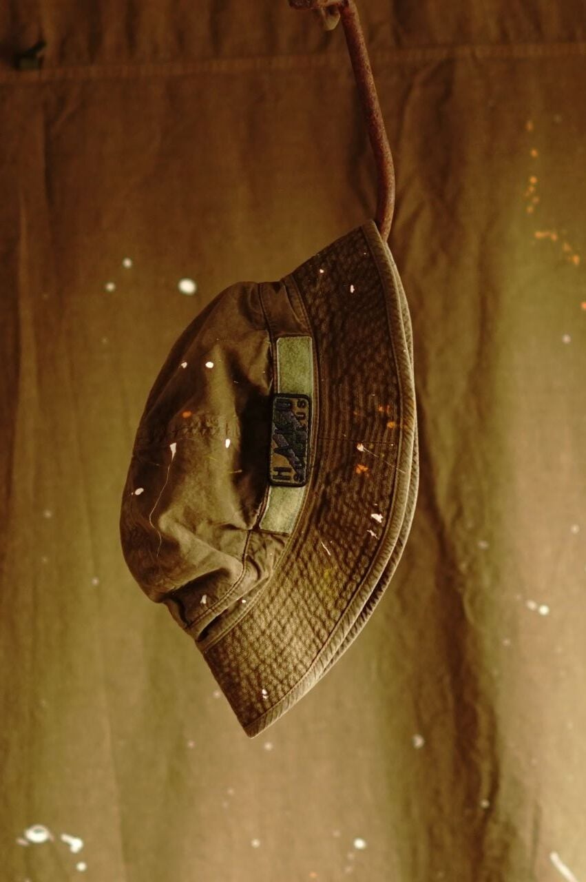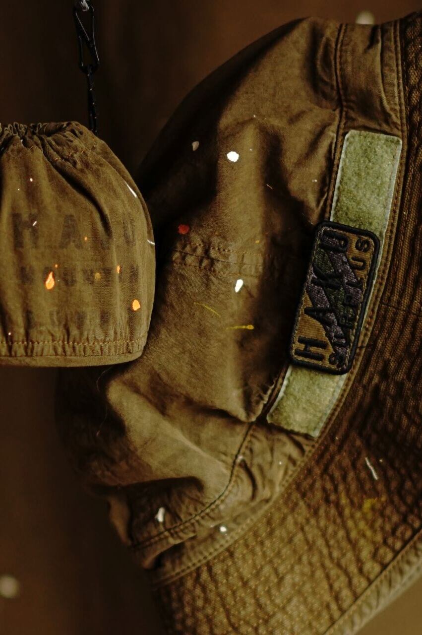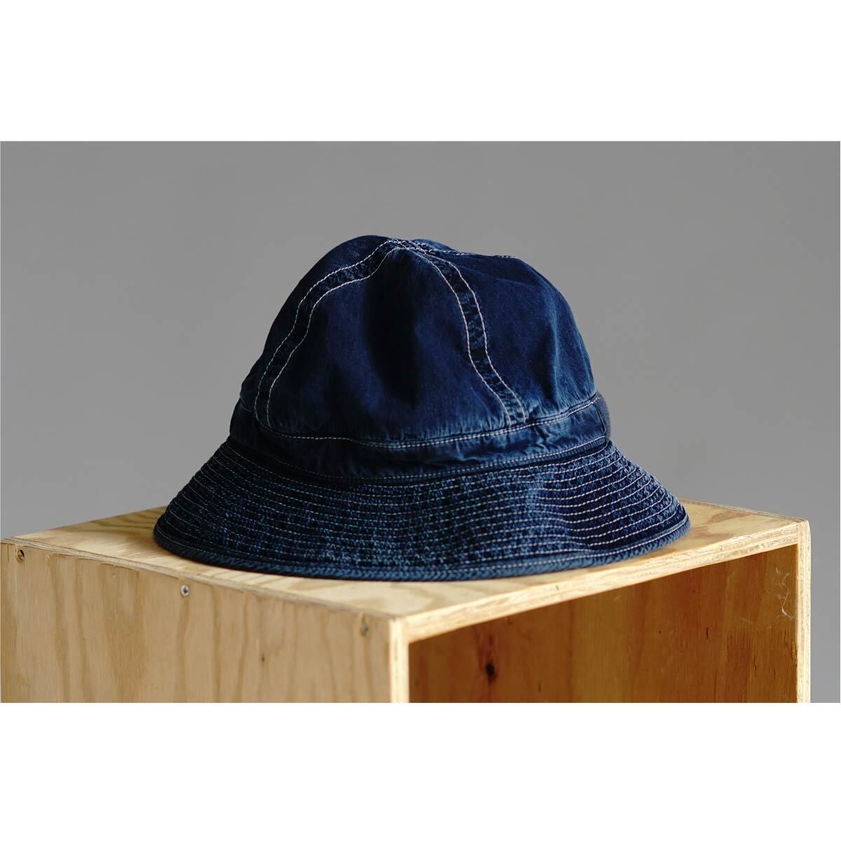 【ロープ染色】でインディゴ染めした綿糸と、強度の強い【フィラメント糸】というナイロンを「ジャガード織機」で織りあげた難燃性&撥水性を兼備したインディゴテントクロスをハチの部分に配し、ツバの部分にはインディゴ染の「刺し子」を使用。左サイドにワッペンアレンジのきくモヘアテープ、両サイドには風飛びや落下防止用のあご紐取付用のループも完備。
