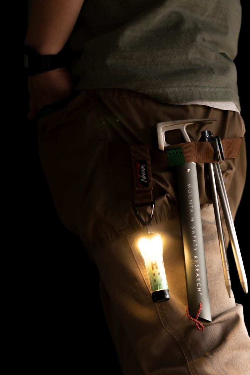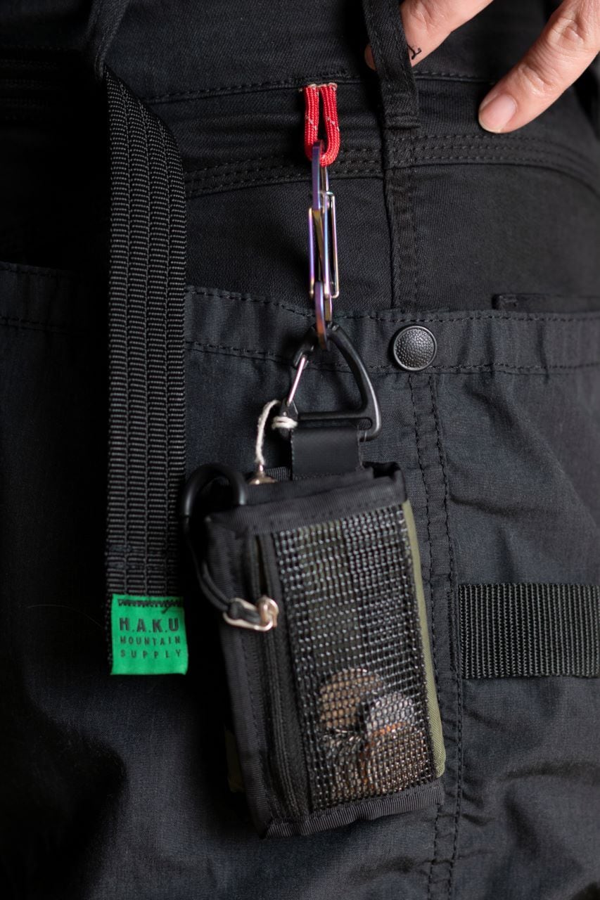 左ポケットにはデイジーチェーンを配置。【NANGA】ロゴ入りのテープカラビナもついていますので、デイジーチェーンにはアウトドアギアやハンドタオルを、カラビナループにはカギやカップなど、使用方法はアイデア次第で無限大。