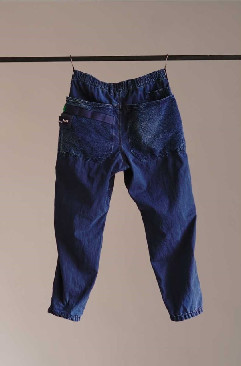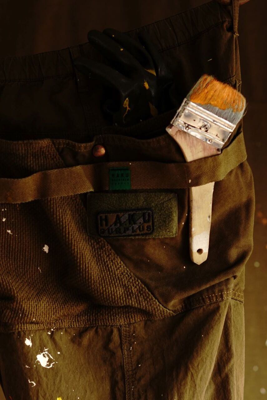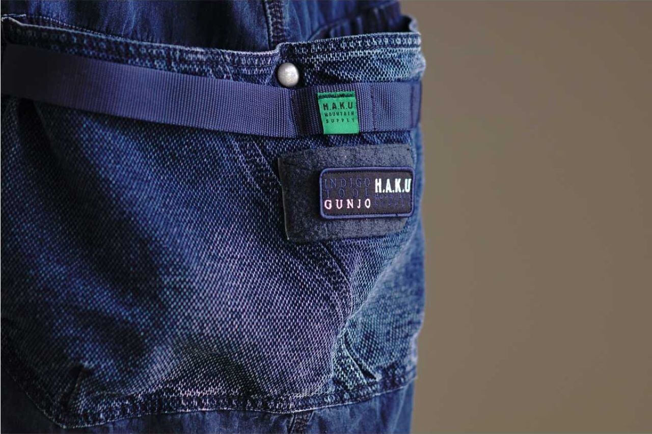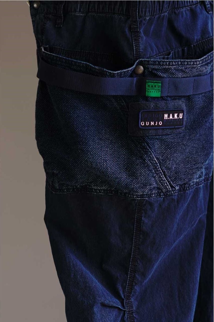 また、≪ハンズフリー(手ぶら)≫で過ごせる大きな収納ポケットも完備。そのポケット生地にはインディゴ染めの「刺し子」を使用。柔道着にも使われる摩擦や引き裂きに強い素材にも、職人技のシェービングが活きています。また、大ぶりのベルクロモヘアテープがワッペンアレンジを可能にしてくれます。